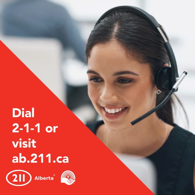 211 is an essential service that helps Albertans find the right resource or service for whatever issue they need help with, at the right time. 211 is available 24/7 by phone, text, and chat. The service is free, confidential and available in over 170 languages over the phone. You can also explore programs and services in your community in their online database at ab.211.ca., opens a new window